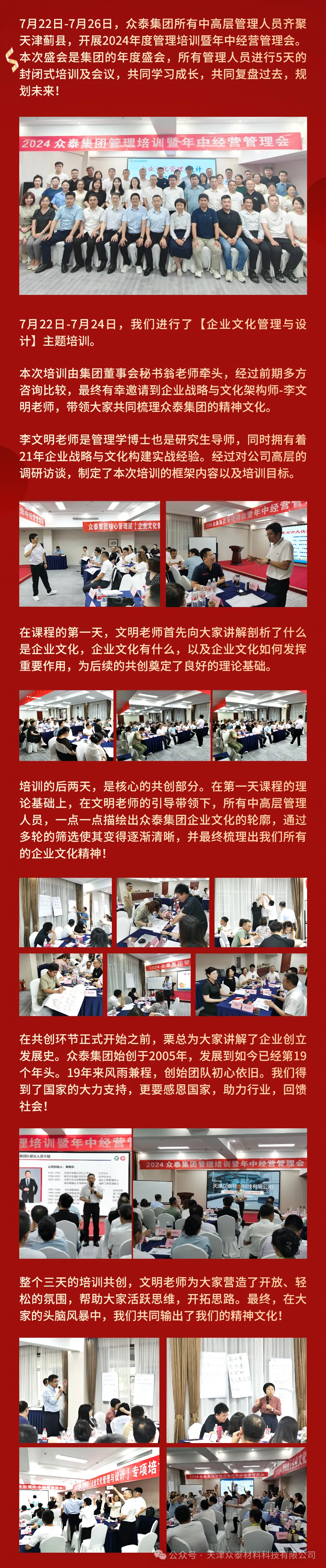 7月22日-7月26日,眾泰集團所有中高層管理人員齊聚天津薊縣,開展2024年度管理培訓暨年中經(jīng)營管理會。本次盛會是集團的年度盛會,所有管理人員進行5天的封閉式培訓及會議,共同學習成長,共同復(fù)盤過去,規(guī)劃未來!